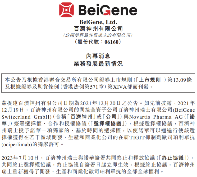 2023年7月11日,百济神州宣布诺华退回TIGIT抗体全球权益。