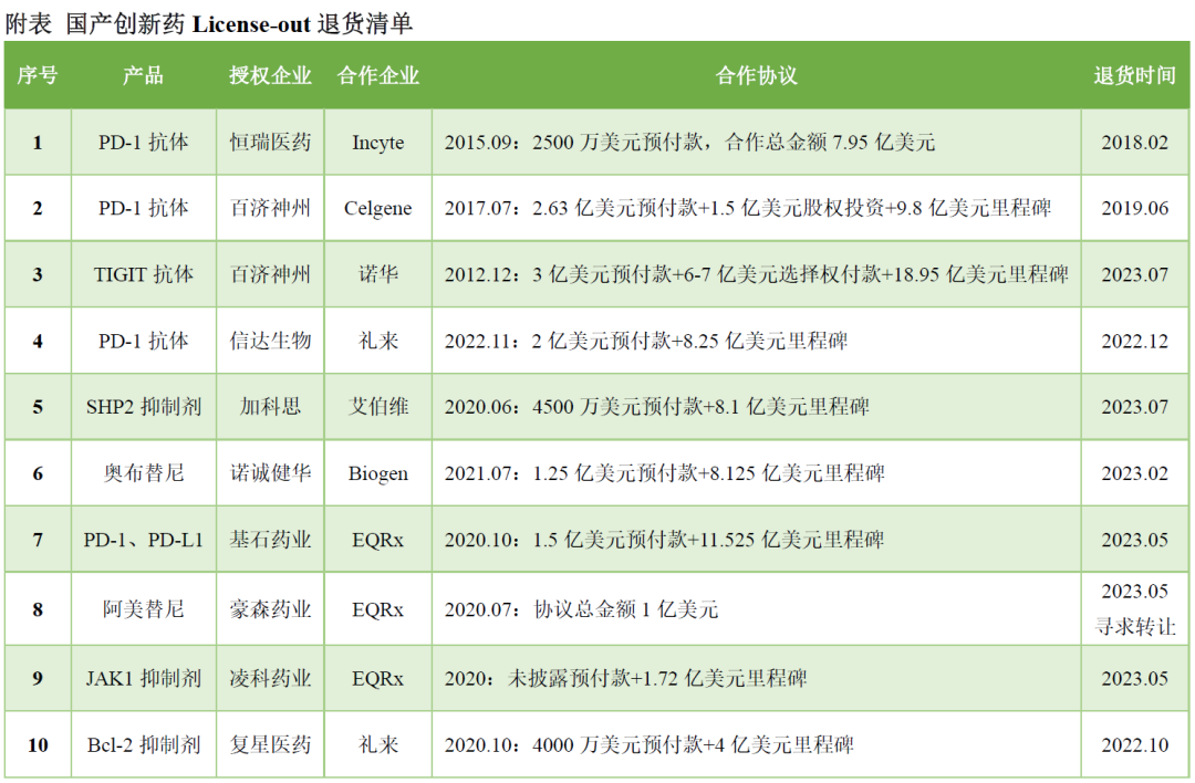 以上统计的退货或拟转让清单中,情况各不相同。恒瑞医药的PD-1抗体授权给Incyte,后可能因为血管瘤副作用等问题被退货。Incyte转而引进Macrogenics的PD-1抗体,并最终在美国获批上市。