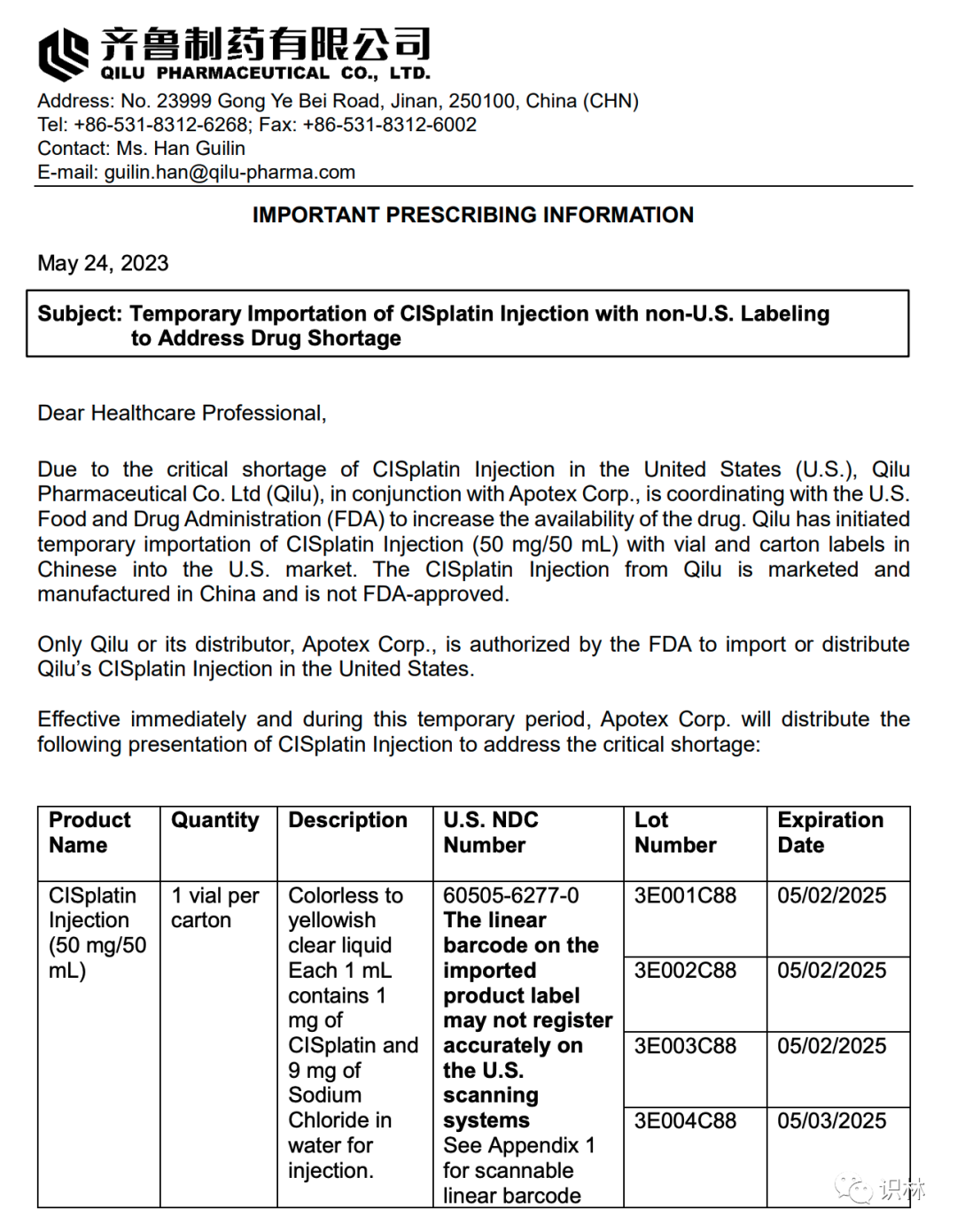 齐鲁的顺铂在今年 5 月份首次获得 FDA 许可进入美国,这些药品未通过正常途径获得 FDA 批准,在药物标签上存在一些差异。这一点在齐鲁给医疗卫生人员的信(截图如下)中也有体现。