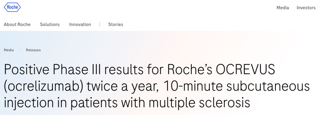 7 月 13 日,罗氏官网宣布,其评估 CD20 单抗奥瑞珠单抗每年两次、每次 10 分钟皮下注射治疗复发性多发性硬化症(RMS)或原发性进行性多发性硬化症(PPMS)患者的 III 期临床试验达到主要终点和次要终点。