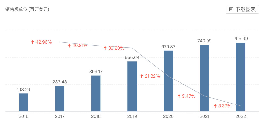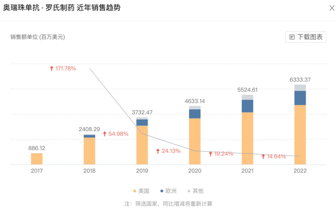 三代 CD20 单抗代表产品奥妥珠单抗同样是罗氏布局的,于 2013 年 11 月获 FDA 批准上市,一线治疗慢性淋巴细胞白血病/小淋巴细胞淋巴瘤。2022 全年收入为 7.65 亿美元,同比上升 3.37%,增长较缓和。