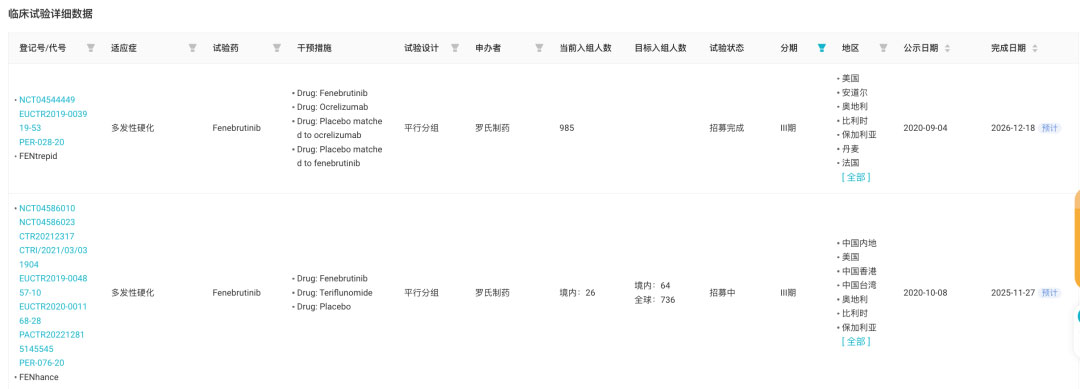 Fenebrutinib(GDC-0853/RG7845)是全球当前唯一跃进 III 期多发性硬化症(MS)研究的非共价 BTK 抑制剂。据 Insight 数据库显示,针对 MS,罗氏正在开展 FENhance、FENtrepid 两项 III 期注册临床试验,预计分别将于 2025 年、2026 年完成。