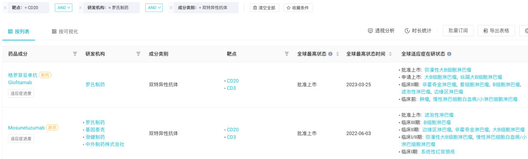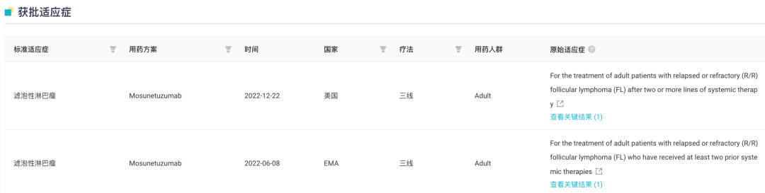 作为全球首款获批用于滤泡性淋巴瘤的 CD20 × CD3 T 细胞结合双特异性抗体,罗氏 Mosunetuzumab(Lunsumio)于去年 6 月在欧盟获得附条件上市批准,用于治疗至少接受过 2 种系统治疗的复发或难治性滤泡性淋巴瘤(FL)成人患者,同年 12 月,获 FDA 批准上市。