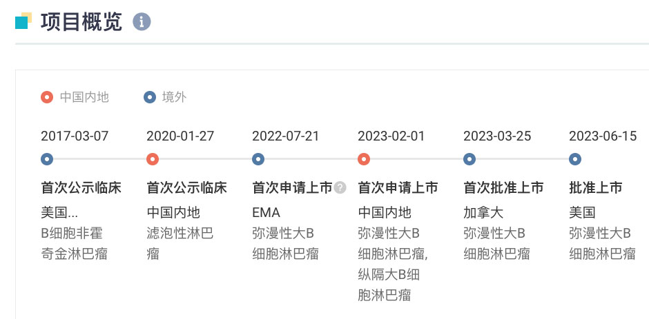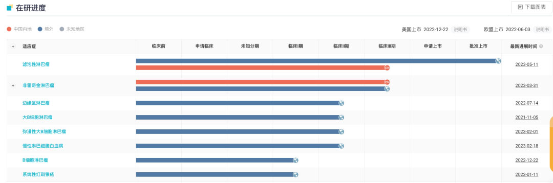 今年 6 月,罗氏宣布,Glofitamab 获 FDA 加速批准,针对既往已接受过至少二线系统治疗的复发或难治性弥散性大 B 细胞淋巴瘤(R/R DLBCL)或由滤泡性淋巴瘤引起的大 B 细胞性淋巴瘤(LBCL)成人患者。此前,罗氏已经率先在加拿大拿下了监管批准,当前在欧洲和中国也处于上市申请中。