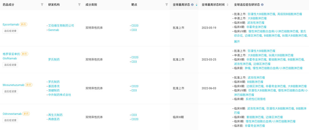 全球 CD3/CD20 双特异性抗体布局(III 期及以上临床阶段)