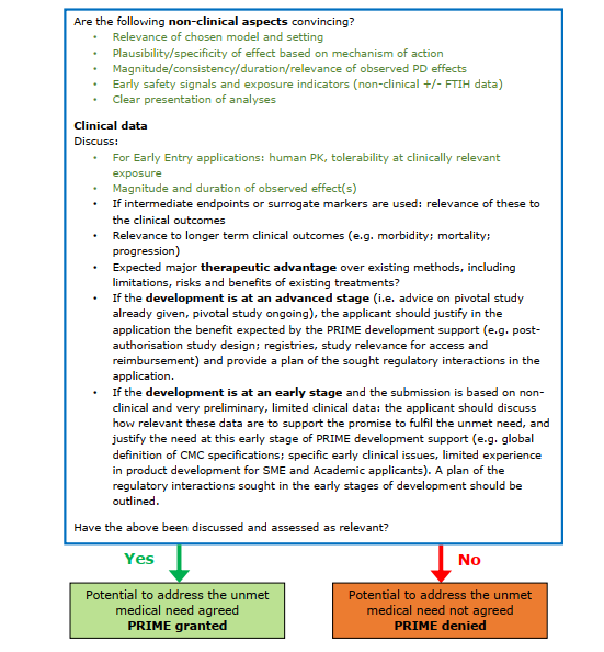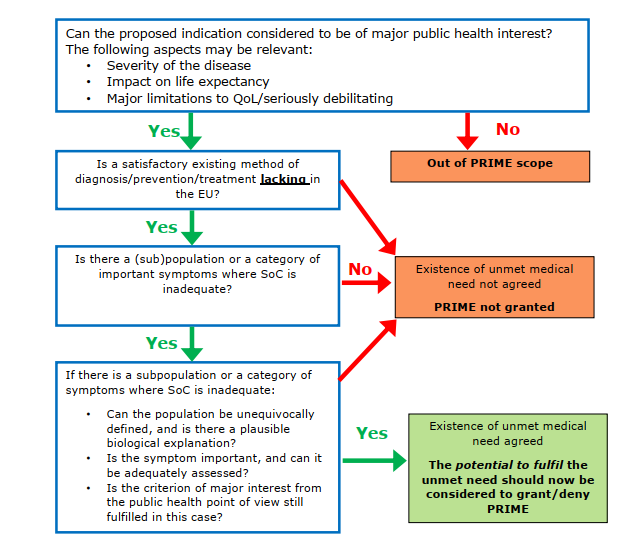 2016年3月,EMA 启动了PRIME计划, PRIME 的资格条件应界定于未满足的医疗需求,如在欧盟没有满意的诊断、治疗和预防手段,或即使存在治疗手段,但该药物具有重大治疗优势。能否进入 PRIME 计划取决于药物的治疗效果( 包括治疗效果的持续时间 ) 和与观察到的临床结果的相关性。