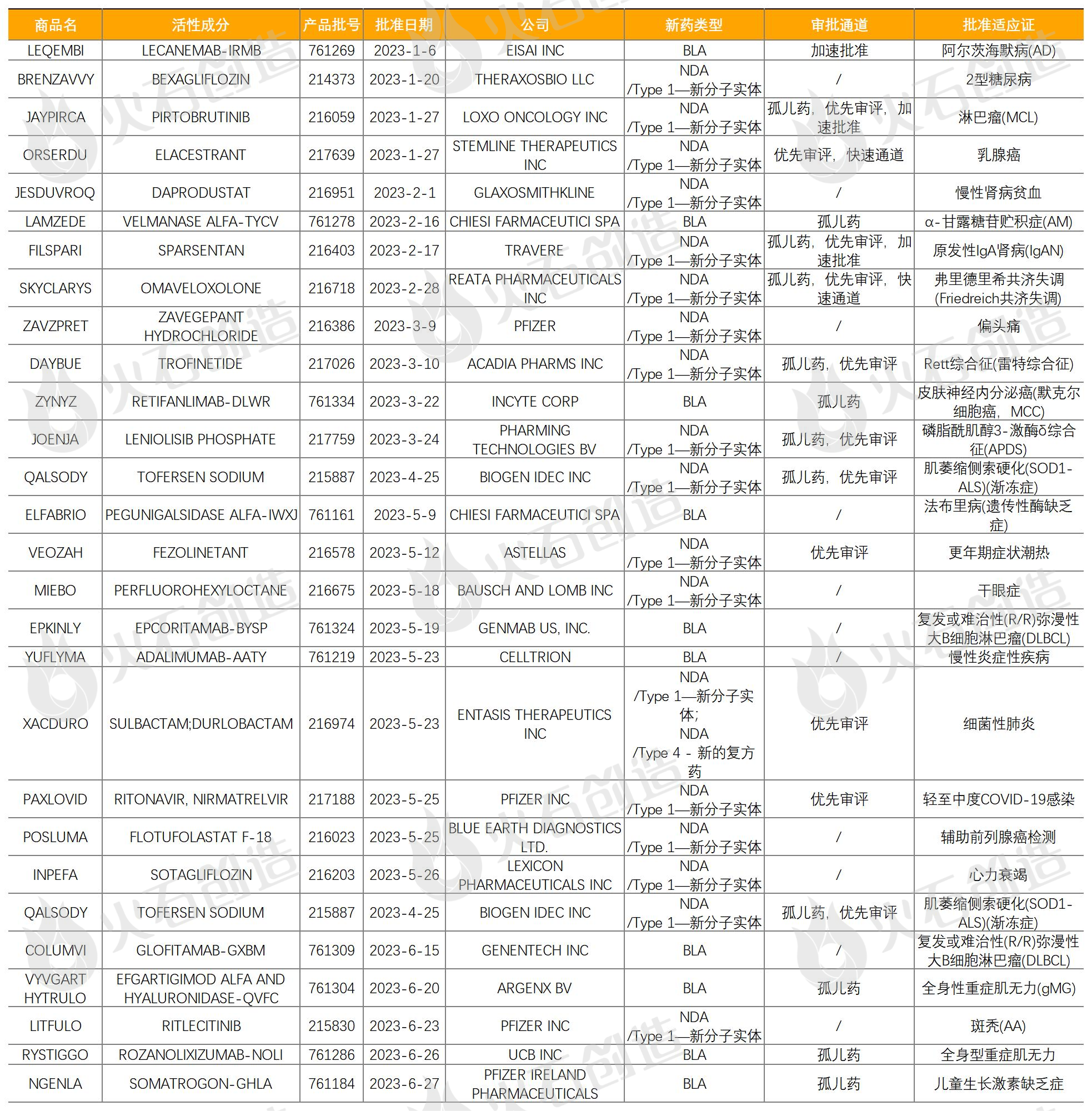 表1 2023年上半年FDA批准NDA新分子实体药物/BLA药物列表