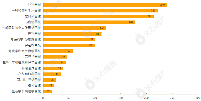 截至2023年7月7日,上半年FDA共批准1575个510(k)途径的产品,其中一类器械72个,二类器械1475个,未分类28个。通过对510(k)上市前通知的器械根据美国医学专业用途进行分类,结果发现,上半年产品获批类型最多的为骨科器械、一般和整形手术器械、放射科器械、心血管器械与一般医院和个人使用类器械,见图4。