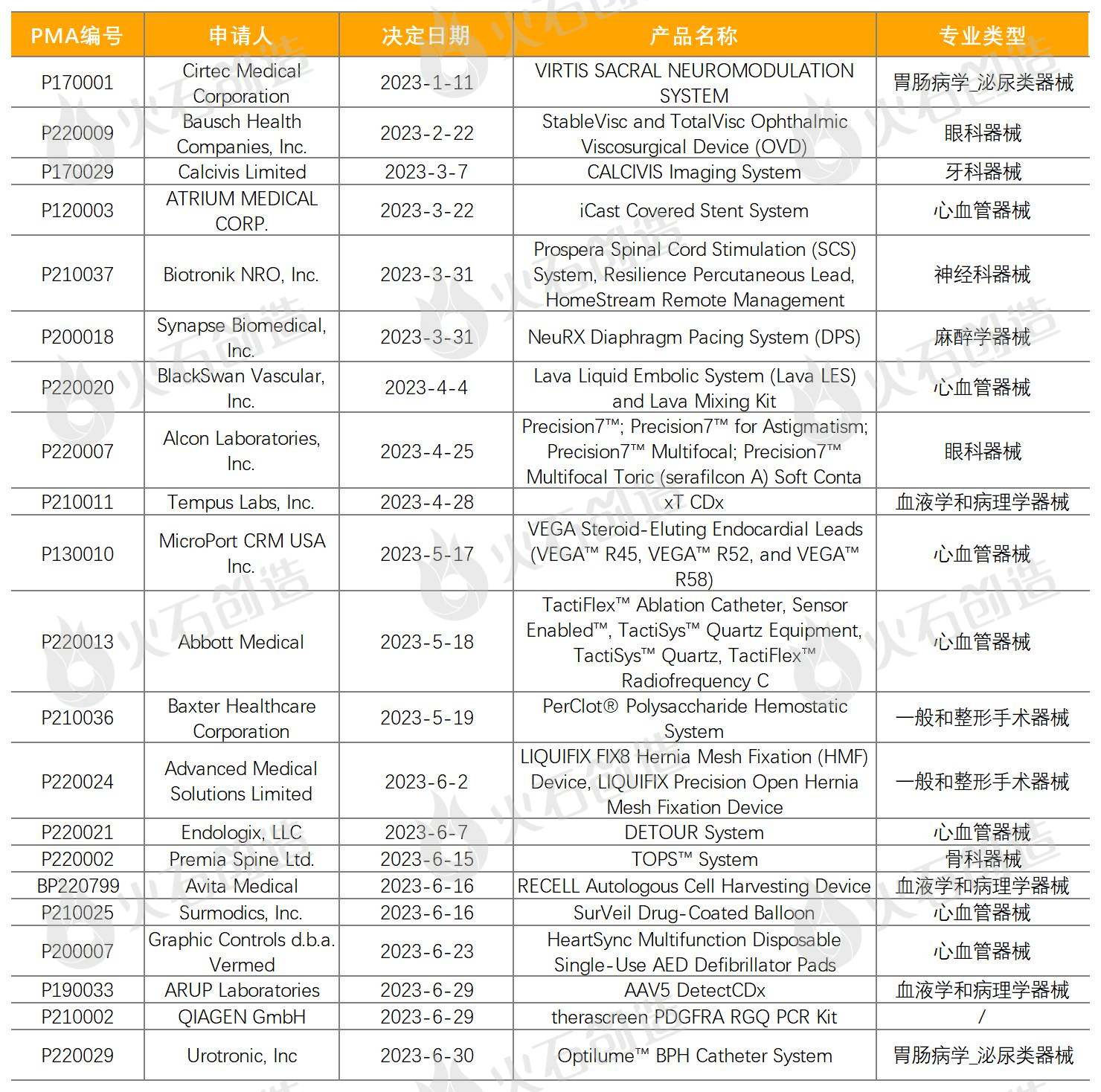 2023年上半年有21个通过上市前批准(PMA)途径首次上市的产品。