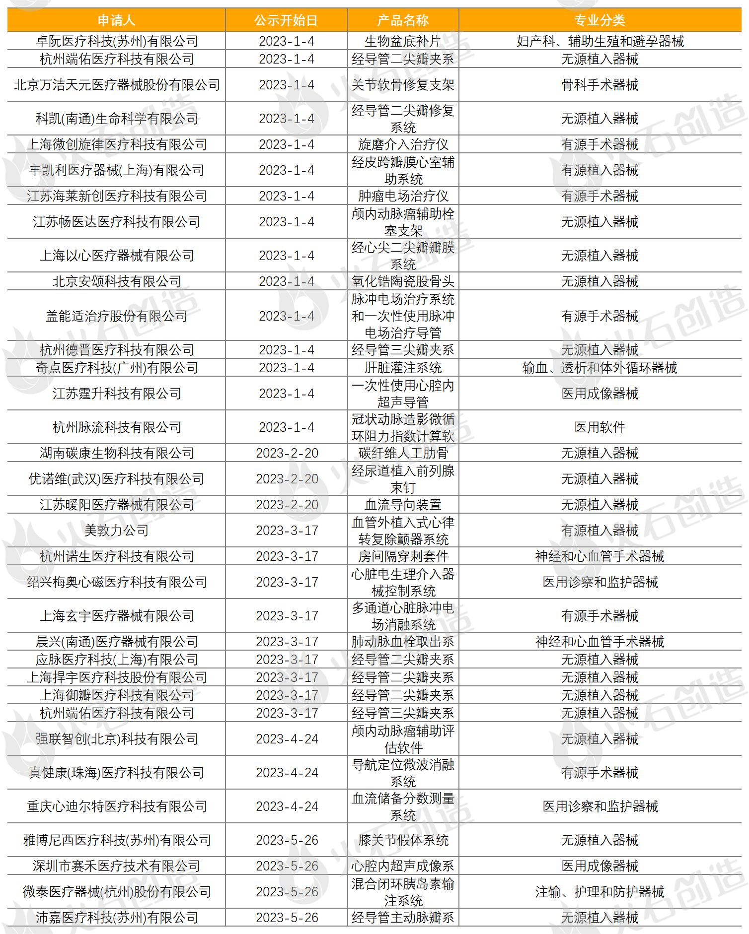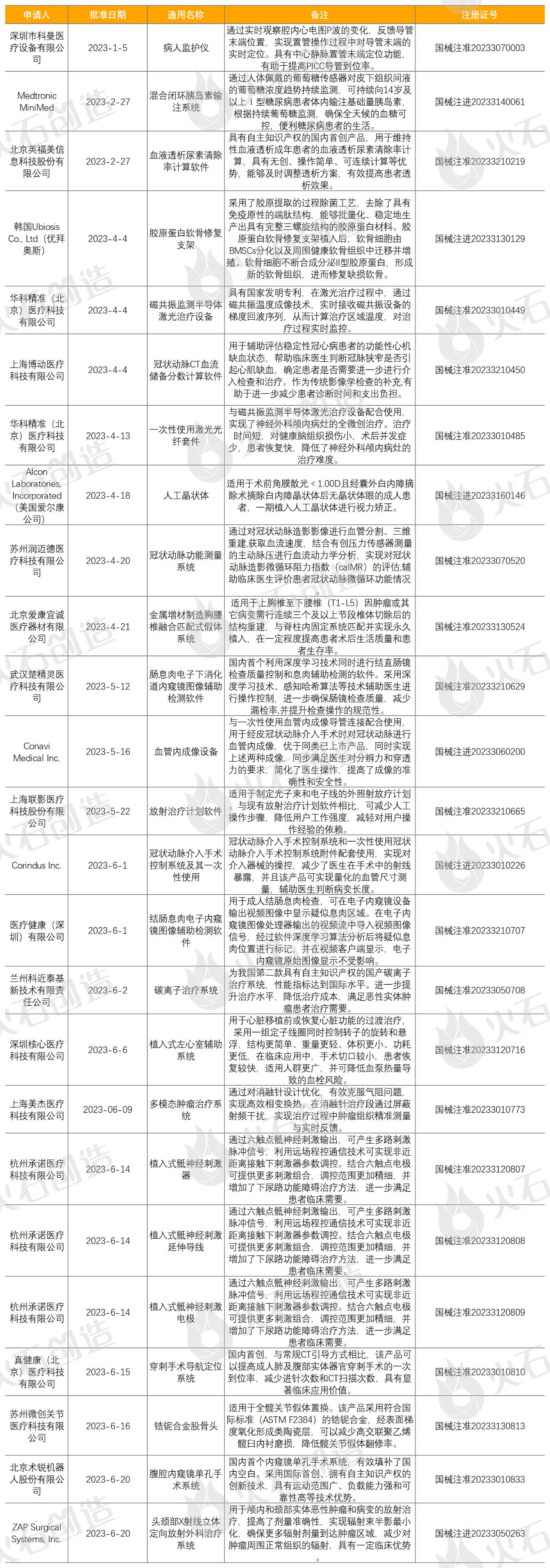 截至2023年7月7日,2023年上半年国家局公示了34个三类医疗器械进入创新审批绿色通道,见表5。