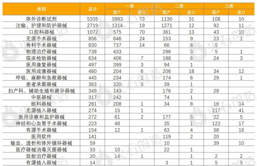 截至2023年7月7日,2023年上半年国家局共批准首次注册三类医疗器械产品1051个,其中国产892个,进口159个。各省级药品监管部门上半年共批准国产第二类医疗器械注册4825个,一类备案医疗器械10230个。统计数据显示,体外诊断试剂数量最多,共5335项,占33.12%,基本上均为国产,为5221项。除体外诊断试剂,批准注册类别数量排前三位的分别为注输、护理和防护器械、口腔科器械,无源手术器械。