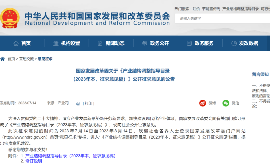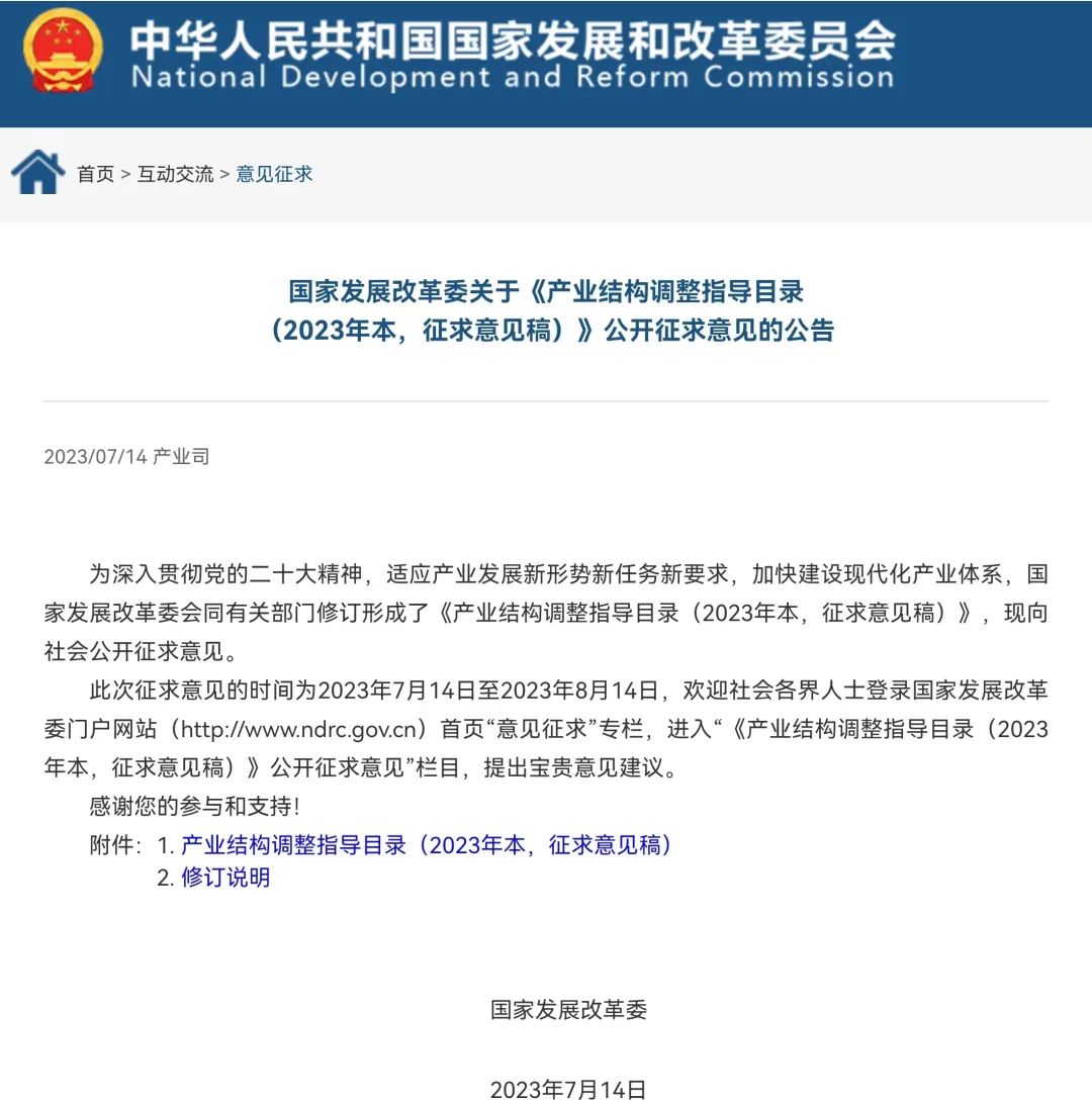 7月14日,国家发改委官网发布公告,公开征求《产业结构调整指导目录(2023年本,征求意见稿)》意见。此次征求意见的时间为2023年7月14日至2023年8月14日,欢迎社会各界人士登录国家发展改革委门户网站(http://www.ndrc.gov.cn)首页“意见征求”专栏,进入“《产业结构调整指导目录(2023年本,征求意见稿)》公开征求意见”栏目,提出宝贵意见建议。