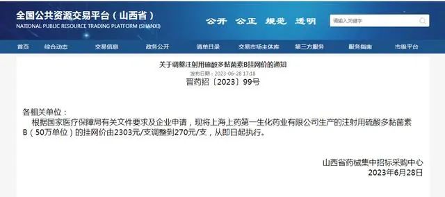 7月14日消息,“(降价)是应相关部门的要求,(同时)也考虑到了该药品的用药特殊性。”日前,上海医药方面向红星资本局解释道,公司旗下注射用硫酸多黏菌素B(50万单位)挂网价从2303元/瓶大幅降价至270元/瓶,并非突然而为,而是一个综合考量的结果。
