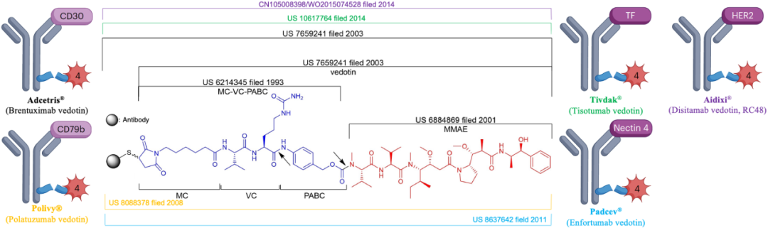 Linker部分涉及的专利可追溯至1993年,百时美施贵宝(Bristol-Myers Squibb)的研究人员开发出一种组织蛋白酶B可裂解的Linker,其中包含与自降解的对氨基苯氧羰基(PABC)间隔子连接的缬氨酸-瓜氨酸(VC)二肽(US6214345)。组织蛋白酶B是细胞中普遍存在的溶酶体蛋白酶,PABC间隔子的存在对组织蛋白酶B裂解VC二肽C端酰胺键至关重要[17];该专利还描述与伯胺(来自PABC)键合的马来酰亚胺-己酰基(MC)部分,三者构成新型Linker:MC–VC-PABC。2003年,Seattle Genetics提交了一项专利,涉及MC-VC-PABC与MMAE的单甲基化胺连接,该Linker-payload被称为Vedotin (US7659241);该专利中还描述了各种ADC的构建,包括Brentuximab vedotin。此后,Seattle Genetics在2007年至2010年间申请了多项ADC专利,涉及各种抗体、Linker和细胞毒性MMAE类似物(US7745394、US7829531、US7851437、US8906376)。