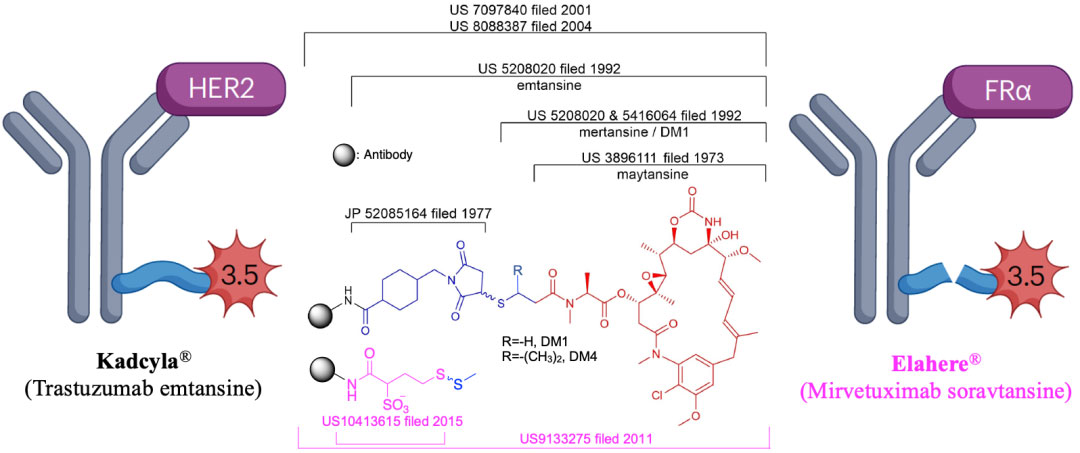 Mirvetuximab soravtansine[32] (图5,Pink)于2022年11月14日获得FDA的加速审批,用于治疗叶酸受体α (FRα)阳性、铂类耐药的上皮性卵巢癌、输卵管癌或原发性腹膜癌(PPC)。IMGN853的Linker-Payload为sulfo-SPDB-DM4 (Soravtansine)[33],其中sulfo-SPDB由ImmunoGen在专利US10413615中公布;DM4与DM1结构类似,在前述专利中公布其结构。ImmunoGen于2011提交关于Soravtansine与抗FRα抗体偶联的专利(US9133275/CN103037900)。针对FRαR靶点,ImmunoGen后续提交了多项专利申请(WO2018213260、WO2019050935、WO2020223221、WO2022256507)。IMGN853是首次批准针对FRα+、铂类耐药卵巢癌的靶向治疗,也是首个批准用于卵巢癌的ADC。根据专利的20年寿命期,部分Payload的专利应该已经/即将到期。预计未来几年将有更多ADC获得批准,其中一些会采用全新的或改进的Linker-payload技术。打算将其ADC商业化的公司应该注意,在利用专利Linker和Payload技术时必须避开专利雷区,同时也要对自身专利进行迭代/衍生、提早布局等,延长自己ADC的市场独占期。
