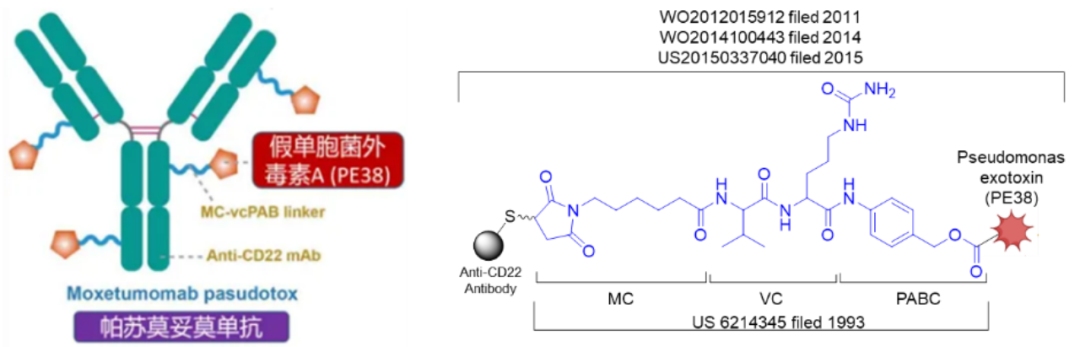 Moxetumomab pasudotox[22] (图3)由阿斯利康研发,于2018年9月由FDA批准用于治疗复发或难治性毛细管白血病(HCL)。Linker采用MC-VC-PABC,其专利归属同前所述(US6214345);Payload为假单胞菌外毒素-PE38[23]。MedImmune (AstraZeneca子公司)于2011年申请专利(WO2012015912),公布就Moxetumomab pasudotox,后续分别于2014年和2015年就Moxetumomab pasudotox制备生产进行了相关的专利申请(WO2014100443和US20150337040)。