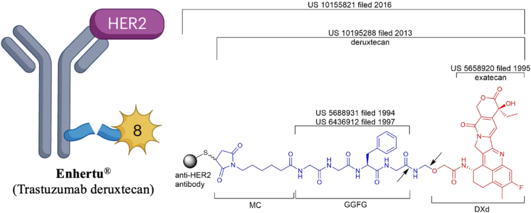 ADC的成功吸引了众多公司加入该赛道,致力于开发新型ADC。与小分子药物相比,ADC的结构更加复杂,因其是由抗体通过不同的偶联方法与细胞毒性有效载荷(Payload)偶联而成,故ADC的专利布局也复杂得多。本文整理了截至2023年4月1日前已批准ADC的保护专利,重点关注其Linker和Payload方面的专利技术[9]。