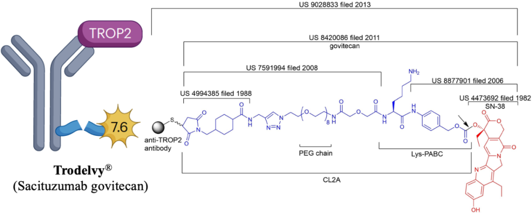 Sacituzumab govitecan[36] (图7)于2020年获批,用于治疗三阴性乳腺癌,其Payload为7-乙基-10-羟基喜树碱(SN-38),其相关专利于1982年申请(US4473692)。与喜树碱一样,SN-38与拓扑异构酶1-DNA复合物结合,防止DNA重新连接,从而导致DNA链断裂,最终导致细胞死亡[37]。2013年,Immunomedics提交了一项专利,涉及多种ADC,其中包括一种靶向肿瘤相关钙信号转导器2 (TROP2)的ADC,其具有与SN-38连接的新型Linker (US9028833),其中一种命名为“CL2A”的Linker后来被用于Sacituzumab govitecan。2006年,Immunomedics曾报道通过酸可裂解碳酸酯键将PABC间隔子连接到SN-38 (US8877901),其基本原理是基于癌细胞的细胞内和溶酶体pH值低于正常生理pH值,ADC可以利用这一点在内化后释放其细胞毒素有效负载[38]。