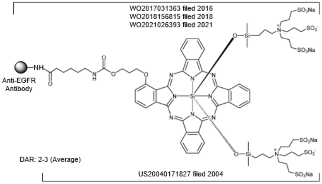 Akalux (图9)由乐天医药(Rakuten Medical)研发,于2021年9月在日本获批上市,用于治疗不可切除的局部晚期或复发性头颈癌[39]。该药物靶向表皮生长因子受体(EGFR),其毒素为IRDye700,属于近红外光敏染料,需要与BioBlade激光系统(690 nm红光)合并使用,激活药物中的抗体从而达到破坏癌细胞的目的(光免疫疗法)。其中关于Payload-IRDye700的专利可追溯至US62206774、US62006790,该专利公布了其制备方法。Rakuten于2016年提交关于Cetuximab Sarotalocan的专利申请(WO 2017031363),提供了制造偶联物的方法,包括制备或生产、配制和包装偶联物的方法,提高偶联物稳定性;该专利还提供了给受试者以进行光免疫治疗的方法。2018年,Rakuten对光免疫治疗进行进一步优化,包括联合用药(WO2018156815)。2020年,Rakuten就Cetuximab与IRDye700偶联位点的选择(轻链Lys145,重链Lys215/292/416)对活性的影响申请了专利(WO2021026393)。