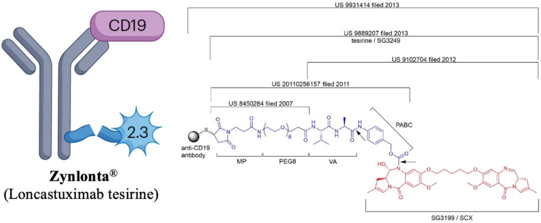 此外,Spirogen还于2011年提交了多项关于ADC Linker的专利申请,其中包括一种具有与聚乙二醇(PEG8)键合的马来酰亚胺丙酰基(MP)部分的Linker,该Linker与缬氨酸-丙氨酸二肽(VA)-PABC间隔子相连,该二肽Linker可被组织蛋白酶B切割(US20110256157)。关于MP-PEG8 Linker,苏黎世大学研究人员早在2007年就报道了连接子(US8450284);关于VA-PABC Linker,Seattle Genetics公司则于2006年在其带有多柔比星Payload的ADC中予以报道。2012年,Spirogen申请了一项含有不同Linker的新二聚体的专利,其中包括VA-PABC (US9102704)。2013年,Spirogen申请了一种新型二聚体PBD细胞毒素-SG3199/SCX-的专利,其与DNA的结合更加牢固,并且不易聚集(US9889207);该专利同时将SG3199与MP-PEG8-VA-PABC Linker键合以产生Linker-payload:Tesirine/SG3249。同年,阿斯利康子公司MedImmune收购了Spirogen,并与ADC Therapeutics合作,共同提交了一项专利,涉及一种带有与Tesirine偶联的抗CD19抗体的ADC (US9931414),后续获批上市。随后,MedImmune于2014年提交了描述二聚PBD类似物新偶联位点的专利(US10188746),并于2018年提交了具有新PBD类似物的新型抗CD19 ADC的专利(US10780181)。