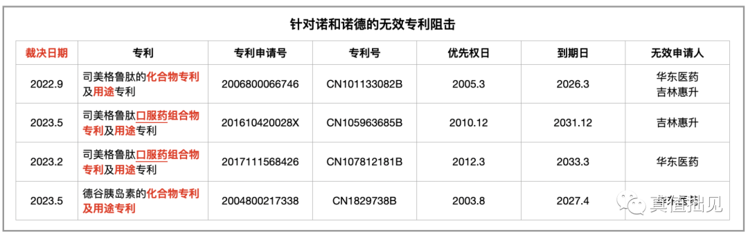 华东医药和四环旗下吉林惠升早就全方位无死角盯上了诺和诺德的多款重磅创新药,大家熟知的是去年9月司美格鲁肽被无效的核心专利。但事实上在最近的1年间,上述两家公司对诺和诺德的多款药物多项专利纷纷展开了专利无效的进攻: