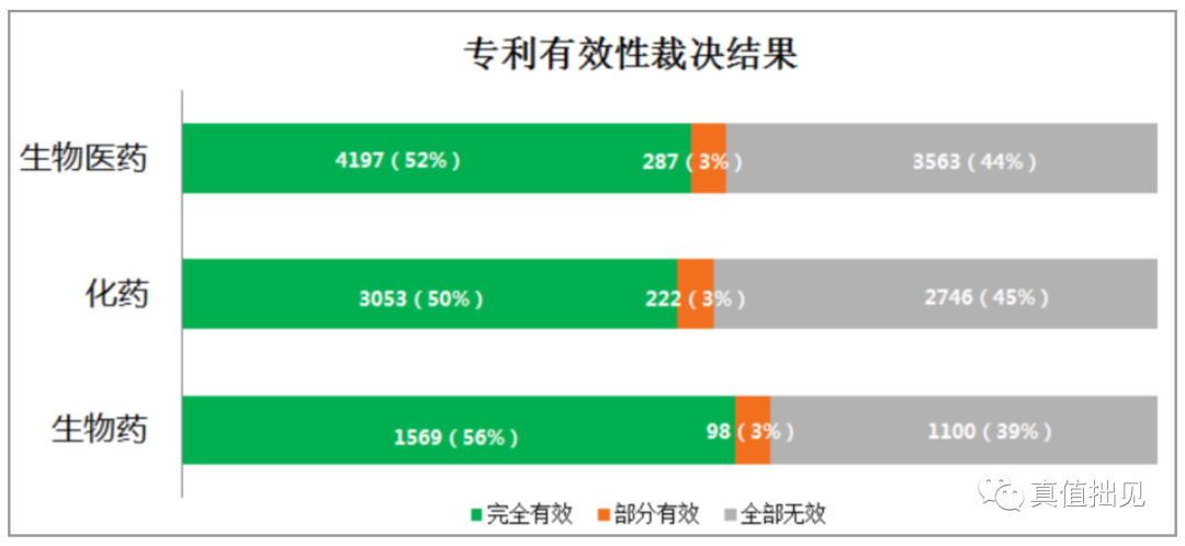 全球判定:专利全部无效+部分无效的比例在42~47%左右。