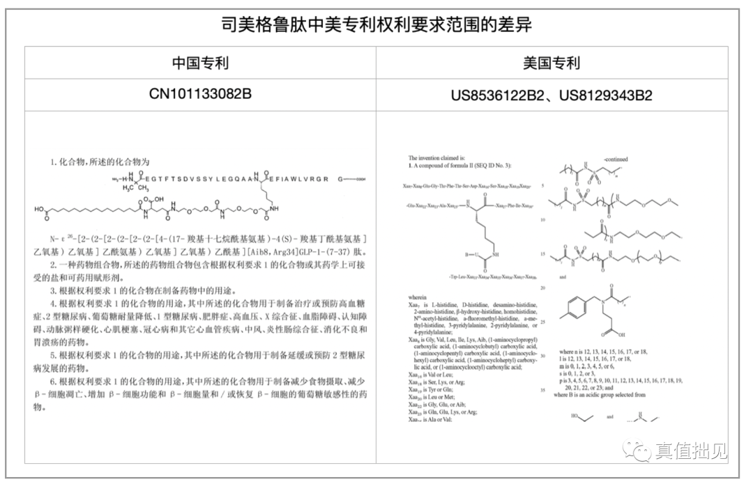 关于本次司美格鲁肽专利被无效的专利,我们先看下同一个母案中,中美专利中关于权利要求的差别: