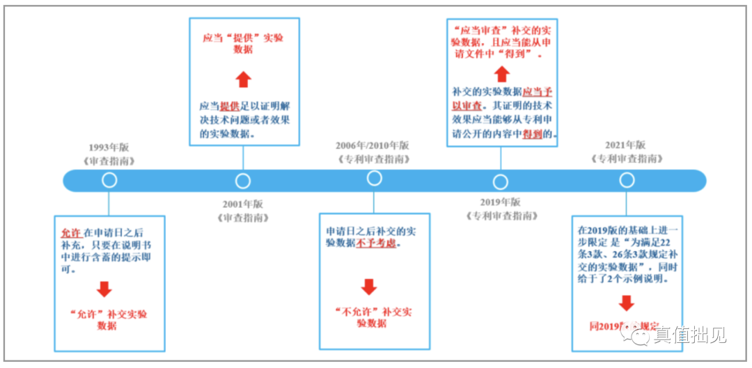 其中:第二十二条第三款:补交实验数据所证明的技术效果应当是所属技术领域的技术人员能够从专利申请公开的内容中得到的。