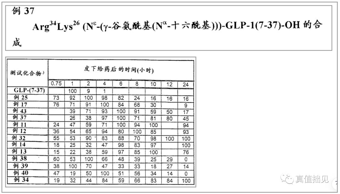 原告认为证据2-1,的实施例37,揭示了亲脂性取代基可以选用H00C(CH2)16CO-可以延长GLP的半衰期,且其中提及了20号位赖氨酸可以共价结合。