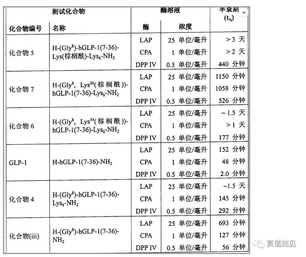 原告认为证据3-1,揭示了在2号位GLP氨基酸中丙氨酸可以替换成Aib的技术启示。并且其中的实验数据表明2号位的氨基酸取代,以及20号位赖氨酸的亲脂取代,可以延长GLP-1的半衰期。