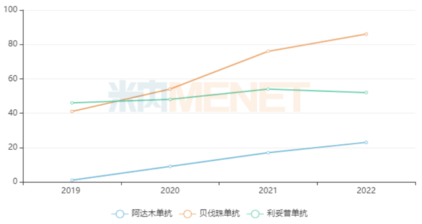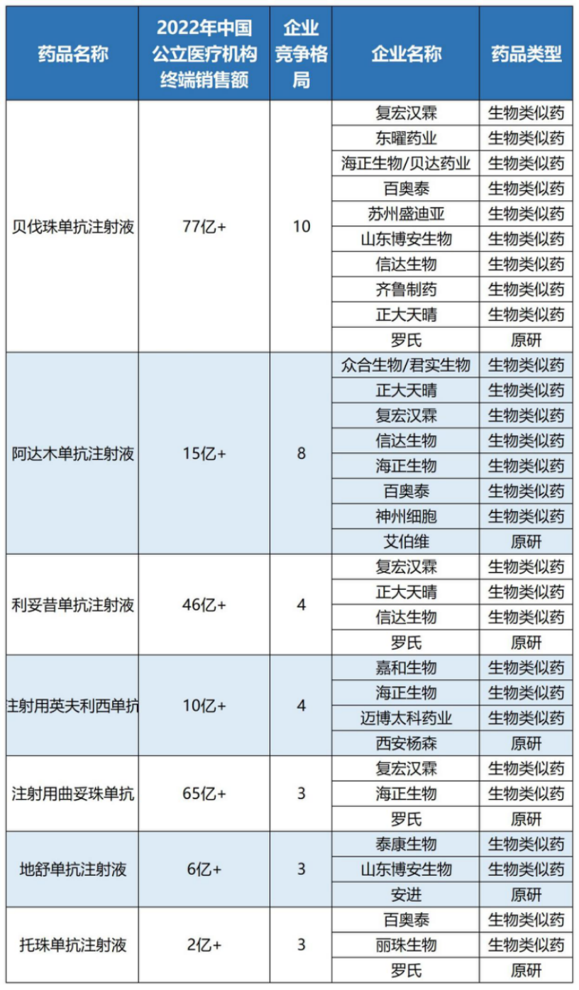2022年中国三大终端六大市场阿达木单抗、贝伐珠单抗及利妥昔单抗销售情况(单位:亿元)随着生物药市场竞争日渐火热,生物药纳入集采亦是大势所趋。据不完全统计,国内生物药及生物类似药获批企业≥3家的品种有7个,包括贝伐珠单抗注射液、注射用曲妥珠单抗、利妥昔单抗注射液、阿达木单抗注射液、注射用英夫利西单抗、地舒单抗注射液以及托珠单抗注射液。数据显示,上述品种2022年在中国城市公立医院、县级公立医院、城市社区中心以及乡镇卫生院(简称中国公立医疗机构)终端销售规模分别超过77、65、46、15、10、6及2亿元。