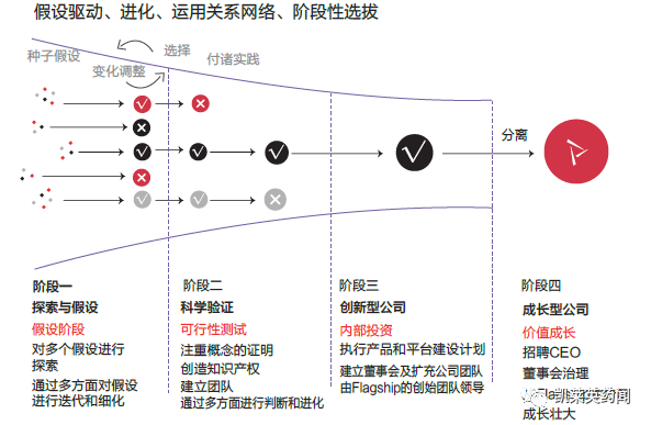 首先,当探索团队提出创新观点后,该观点将被作为风险假设,通过专家和相关人士对该风险假设的意见反馈来确定是否可行。初步被认为可行的风险假设将进入实验室进行科学验证,在进一步确定其可行性的同时,创建以项目编号命名的原型公司。随后,Flagship将原型公司转化为创新型公司,并进一步对已获得实验验证的原型产品进行实践。最后,创新型公司将转型为成长型公司,最终从Flagship分离,走向市场。