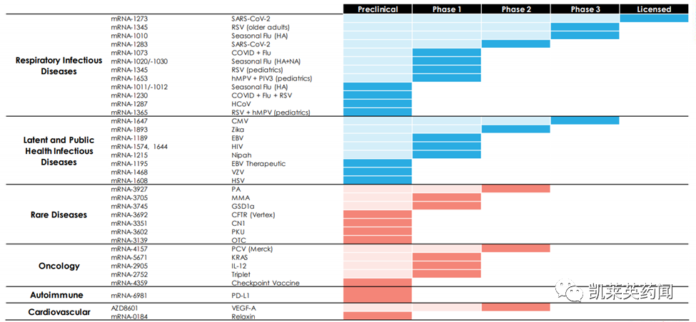 产品管线方面,除了2021年上市的新冠疫苗外,Moderna凭借其mRNA技术平台开发了35条研发管线,布局领域包括感染性疾病、癌症、罕见病和自免疫疾病。主要候选药物包括个性化癌症疫苗 (PCV)mRNA-4157、罕见病mRNA 候选药物mRNA-3927、呼吸道合胞病毒(RSV)候选疫苗mRNA-1010 、呼吸道综合疫苗mRNA-1073等。