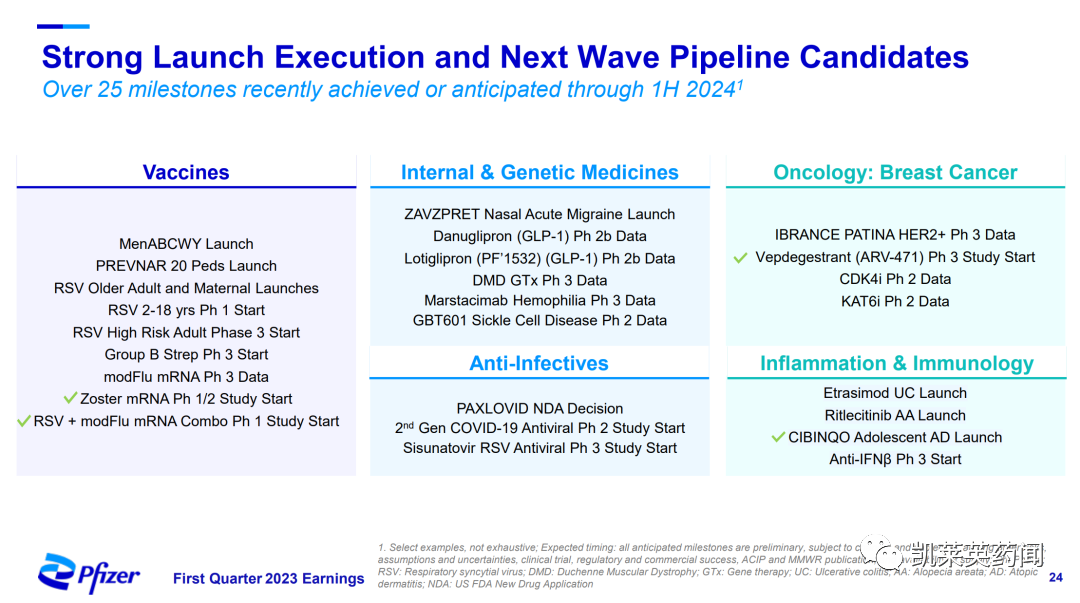 据辉瑞2023 Q1季报显示,公司有12 个项目新增或进展到新的阶段;预计 2023 H2 将是新药/新适应症推向市场的密集期,并将带来高于上半年的高增长,适应症领域涵盖疫苗、内科及遗传药物、乳腺肿瘤药物,抗感染药物,炎症与免疫学领域药物。