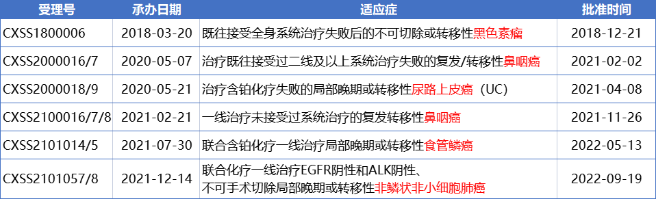 截至目前,特瑞普利单抗已在中国获批6项适应症:用于既往接受全身系统治疗失败的不可切除或转移性黑色素瘤的治疗(2018年12月);用于既往接受过二线及以上系统治疗失败的复发/转移性鼻咽癌患者的治疗(2021年2月);用于含铂化疗失败包括新辅助或辅助化疗12个月内进展的局部晚期或转移性尿路上皮癌的治疗(2021年4月);联合顺铂和吉西他滨用于局部复发或转移性鼻咽癌患者的一线治疗(2021年11月);联合紫杉醇和顺铂用于不可切除局部晚期/复发或远处转移性食管鳞癌患者的一线治疗(2022年5月);联合培美曲塞和铂类用于表皮生长因子受体(EGFR)基因突变阴性和间变性淋巴瘤激酶(ALK)阴性、不可手术切除的局部晚期或转移性非鳞状非小细胞肺癌的一线治疗(2022年9月)。