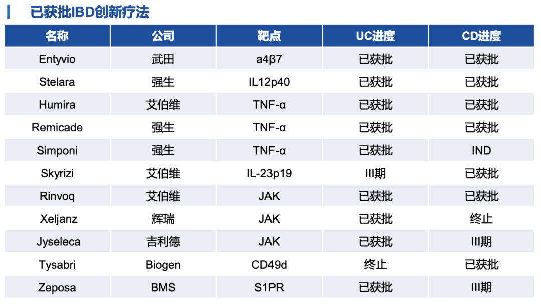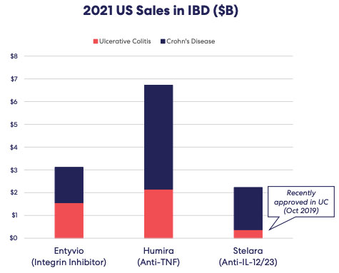 炎症性肠病(IBD)是热门领域之一。据统计,2021年美国IBD药物市场约为150亿美元,且仍在高速增长,而纵观Entyvio(武田)、Humira(艾伯维)和Stelara(强生)在IBD适应症上的表现,它们的总销售规模已达到120亿美元。