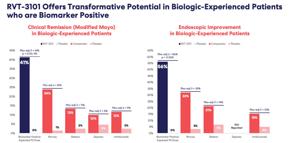 在新公司Telavant成立的新闻稿上,辉瑞首席科学官兼全球研究、开发和医疗总裁Mikael Dolsten曾信誓旦旦说道,他们坚信RVT-3101将成为首个为IBD患者提供生物标志物选择的精准药物。 RVT-3101面临的对手不仅只是TL1A抗体竞争者PRA-023,在更广泛的UC领域,Roivant将RVT-3101与已获批的Rinvoq、Stelara、Zeposia以及在研的mirikizumab进行对比,结果似乎也支持了Mikael Dolsten的对外说法。