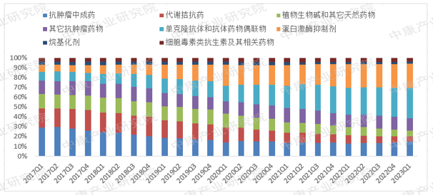 图1:2017Q1~2023Q1抗肿瘤药物等级医院品类占比变化趋势