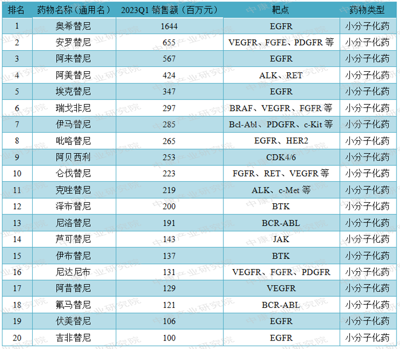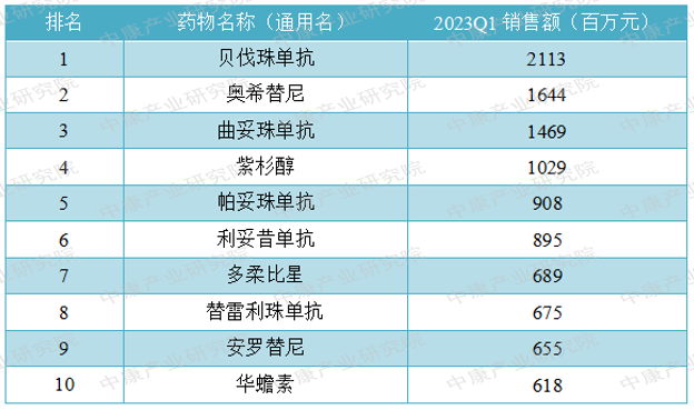 表1:2023Q1抗肿瘤药物等级医院销售额TOP10