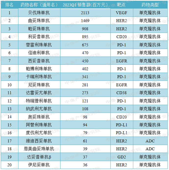 表2:2023Q1单抗和ADC类抗肿瘤药等级医院销售额TOP20