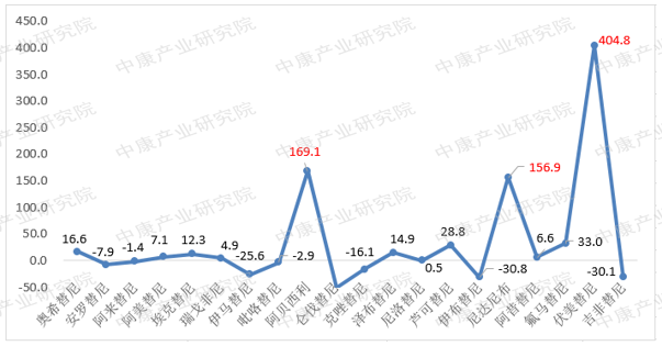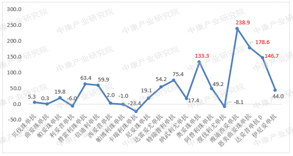 图3:2023Q1蛋白激酶抑制剂类抗肿瘤药等级医院销售额TOP20同比增长率/%