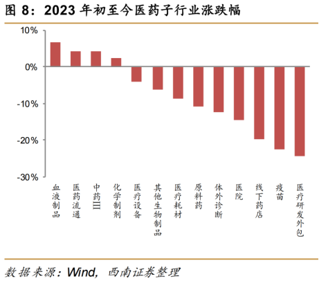 回顾2023年初至今医药生物板块二级市场表现,医药各子行业涨跌不一,年初至今表现最好的子行业是血液制品,上涨幅度为6.6%;曾经低调的医药流通和中药也走向了舞台高光。