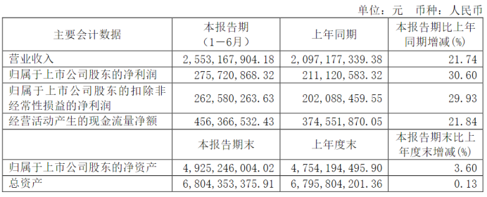具体来看,康缘药业上半年营收、净利润双增长,实现营业收入25.53亿元,同比增长21.74%;归母净利润2.76亿元,同比增长30.60%;经营性现金流量净额4.56亿元,同比增长21.84%。