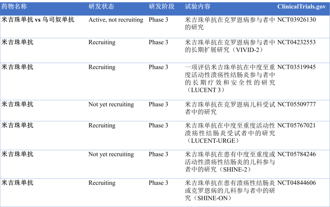 Mirikizumab 也在探索在儿童溃疡性结肠炎或克罗恩病患者中的研究(NCT05509777、NCT05784246、NCT04844606)(图3),可能获批用于治疗儿科人群,即扩展患者人群,这也使得 mirikizumab 不同于其他同类竞品,填补了该患者人群可用靶向治疗药物有限这一空白。除此之外,也在进行一些成人患者中的研究(图3)。