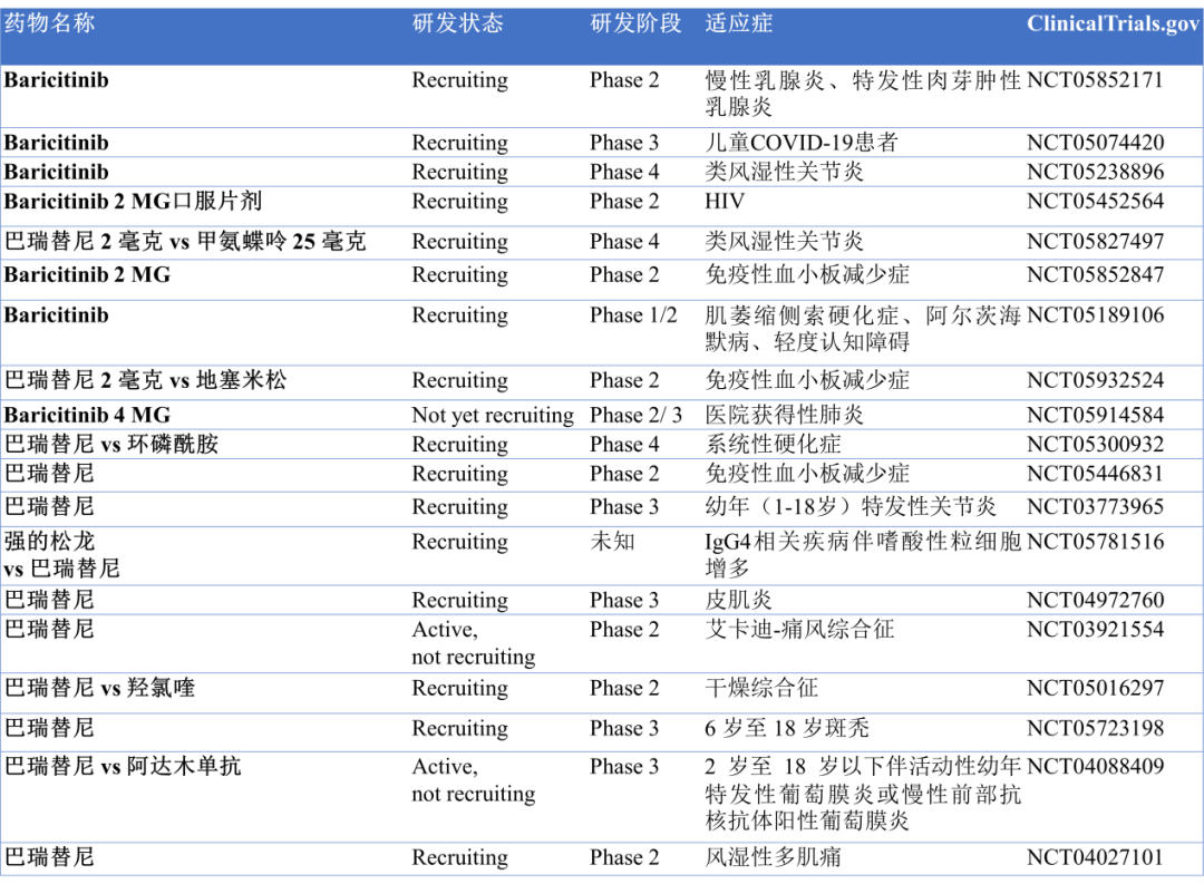 图4.巴瑞替尼的部分临床试验 (数据来源于clinicaltrials.gov数据库)