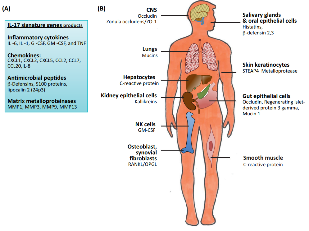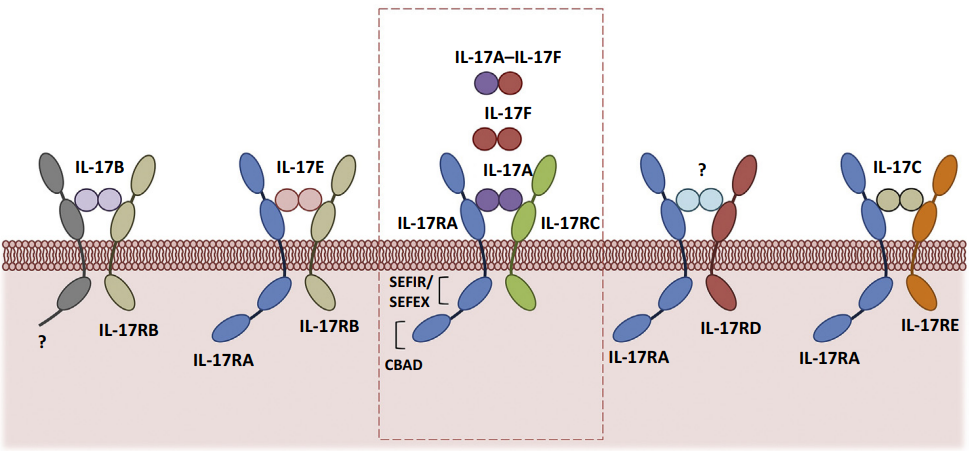 IL-17A是IL-17家族的原型细胞因子,参与正常的炎症和免疫反应,它在斑块状银屑病,银屑病关节炎和强直性脊柱炎等的发病过程中起关键作用。IL17家族有6成员,包括IL-17A(IL-17)、IL-17B、IL-17C、IL-17D、IL-17E(IL-25)和IL-17F。IL-17受体家族由五种不同的受体IL-17R / IL-17RA,IL-17B R / IL-17RB,IL-17RC,IL-17RD / SEF和IL-17RE组成,它们具有共同的细胞质基序称为SEFIR(成纤维细胞生长因子)域。IL-17RA是所有其他受体的共同亚基,也包括抑制性CBAD(C / EBPβ激活)结构域[3]。
