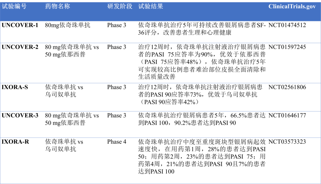 图8. 依奇珠单抗的部分临床结果。标注:在斑块型银屑病临床试验中,PASI 75(≥使银屑病面积和严重程度指数减少75%)传统上一直是治疗效果的基准。 (数据来源于clinicaltrials.gov数据库)