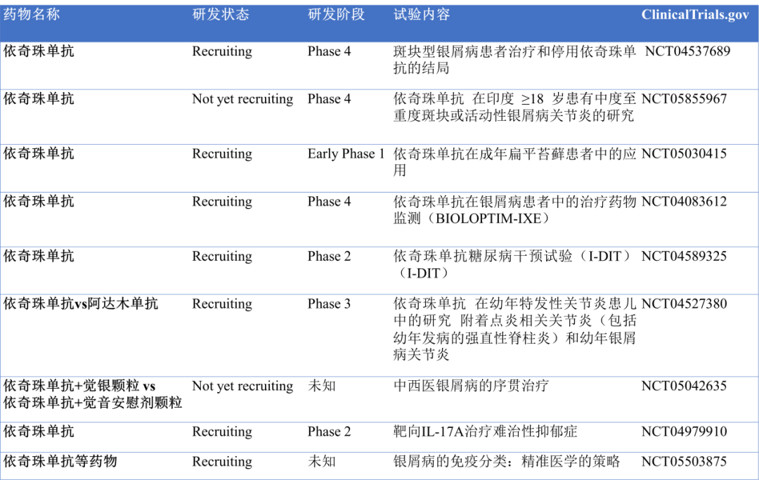 图9. 依奇珠单抗部分临床在研试验 (数据来源于clinicaltrials.gov数据库)