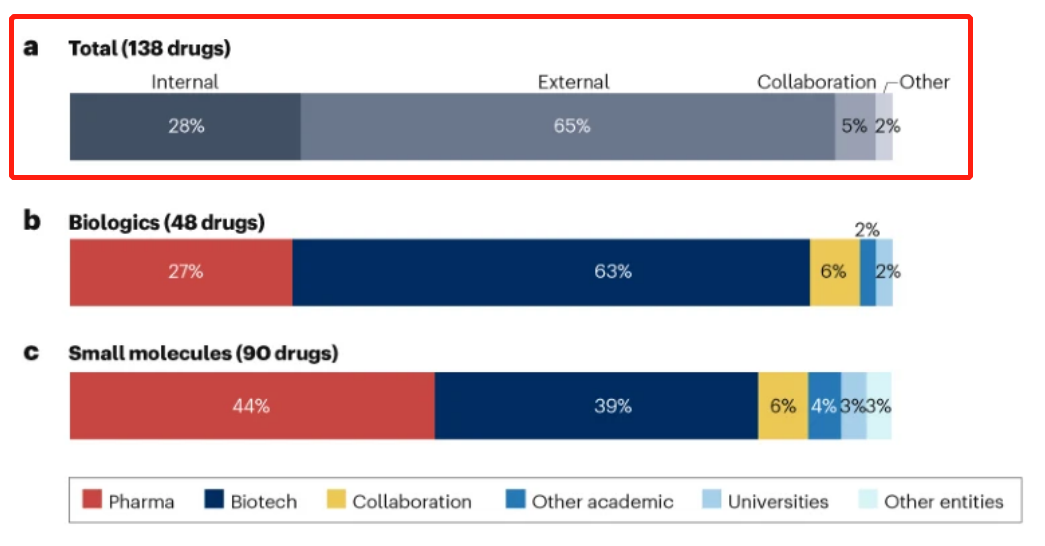 再来看一组数据。138款创新药中,65%是MNC通过许可或并购引自外部,仅28%为自主研发,另有5%为合作推出。由此可见,更高比例的创新药产出,源头属于Biotech。实力再强悍的制药公司,很大程度上也需要吸收外部创新。