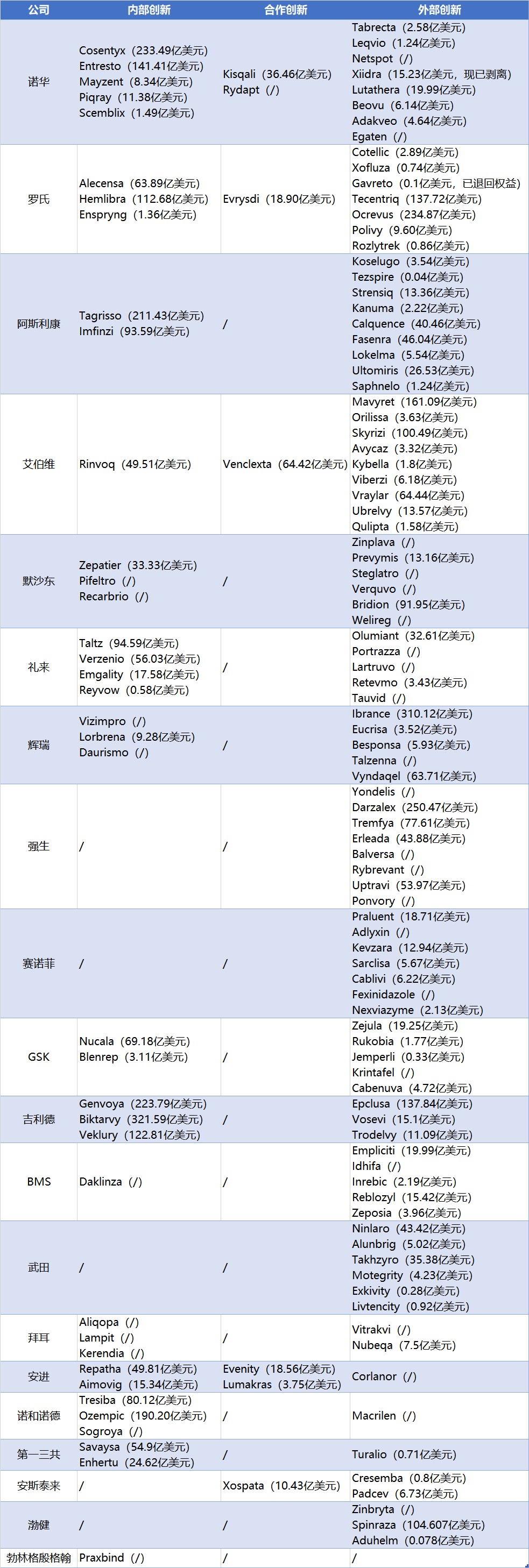 除了以上提到的MNC,其他包括诺华、吉利德、GSK、辉瑞等在内的多个大型制药公司发展至如今庞大体量,均不同程度通过并购或者合作引进外部创新,基于战略需求来规划产品管线走向。由于篇幅有限,本文暂不一一列举。